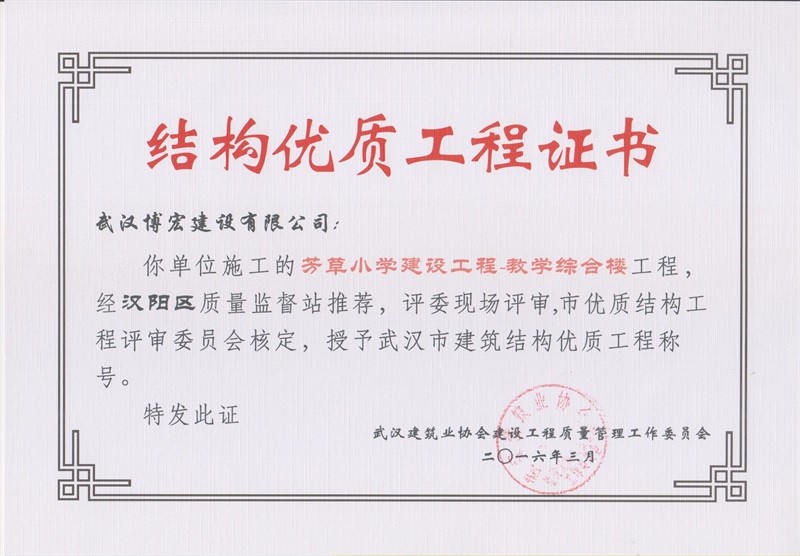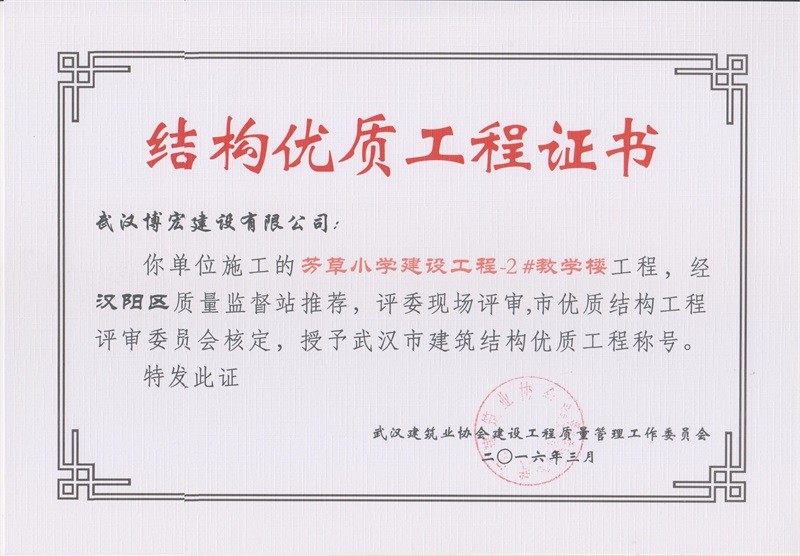 芳草小學(xué)-1#教學(xué)樓結(jié)構(gòu)優(yōu)質(zhì)工程證書