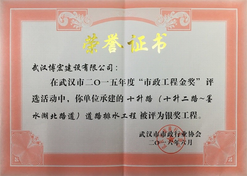2015年度市政工程銀獎(jiǎng)(十升路道排)
