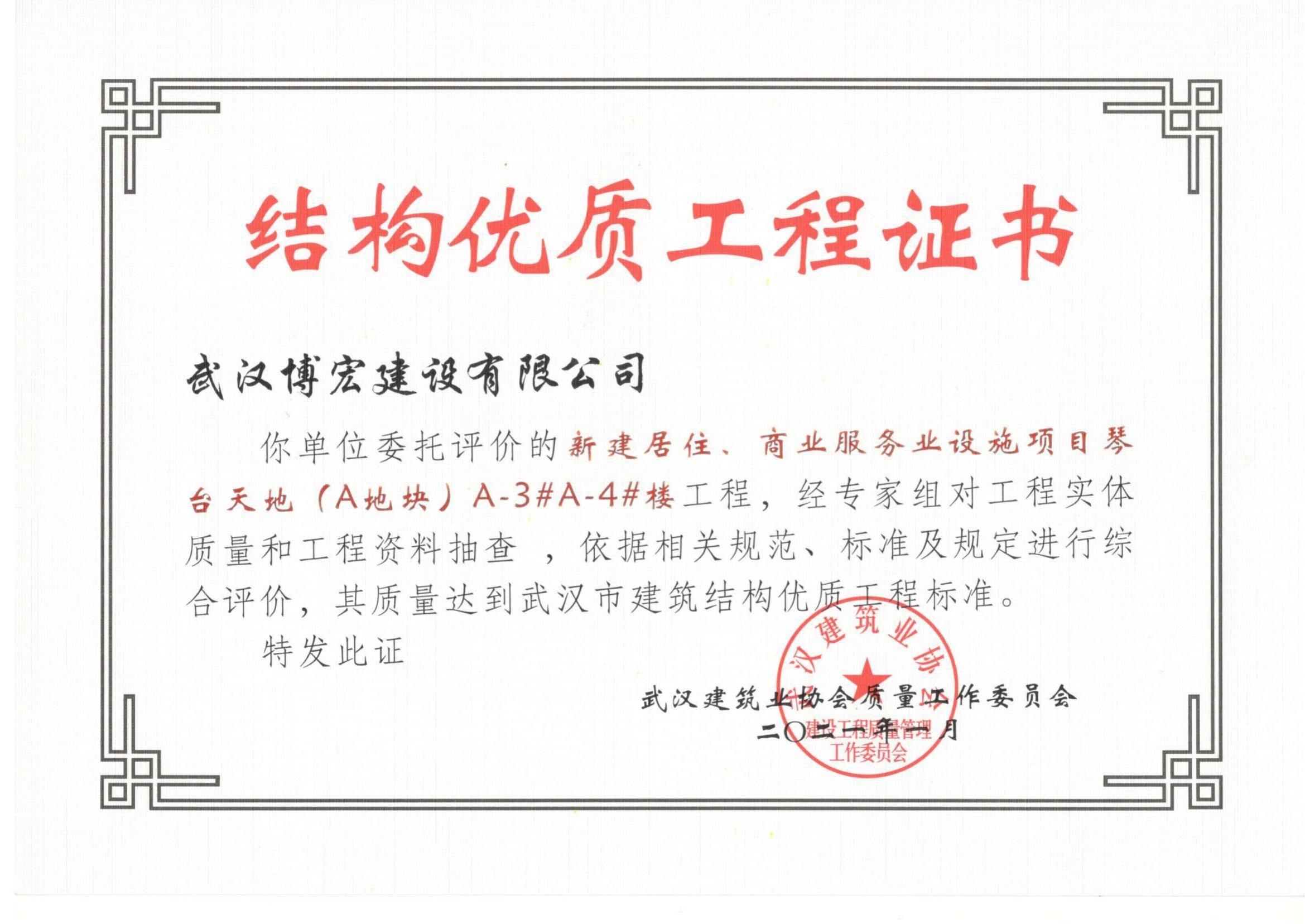 2021年武漢市結構優(yōu)質(zhì)工程(琴臺天地(A地塊)3、4棟