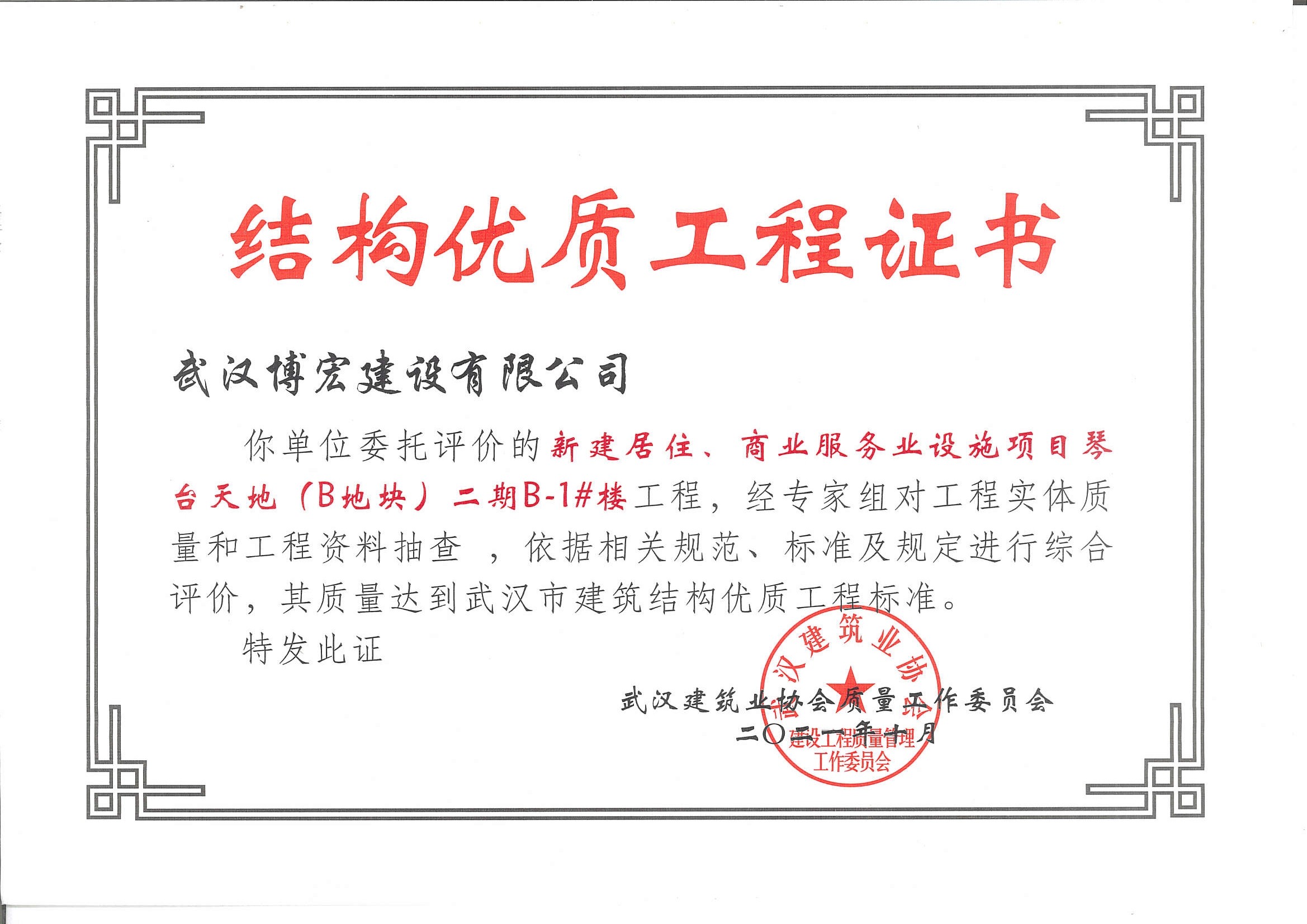 琴臺天地(B地塊)二期B-1#樓武漢市建筑結構優(yōu)質(zhì)工程