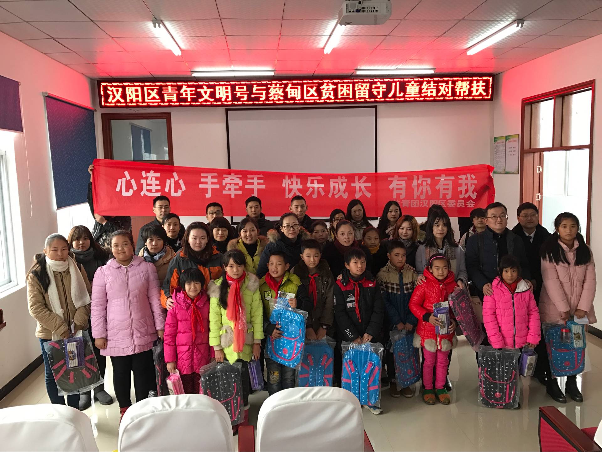 11月24日,為認(rèn)真落實(shí)共青團(tuán)助力脫貧攻堅(jiān)電視電話會(huì)議精神,根據(jù)“關(guān)愛留守兒童,助力精準(zhǔn)扶貧”行動(dòng)整體安排,漢陽團(tuán)區(qū)委組織全區(qū)20個(gè)市級(jí)以上青年文明號(hào)單位赴蔡甸區(qū)消泗鄉(xiāng),集中慰問幫扶貧困留守兒童,并進(jìn)行現(xiàn)場(chǎng)結(jié)對(duì),我公司參與了此次慰問幫扶活動(dòng)。