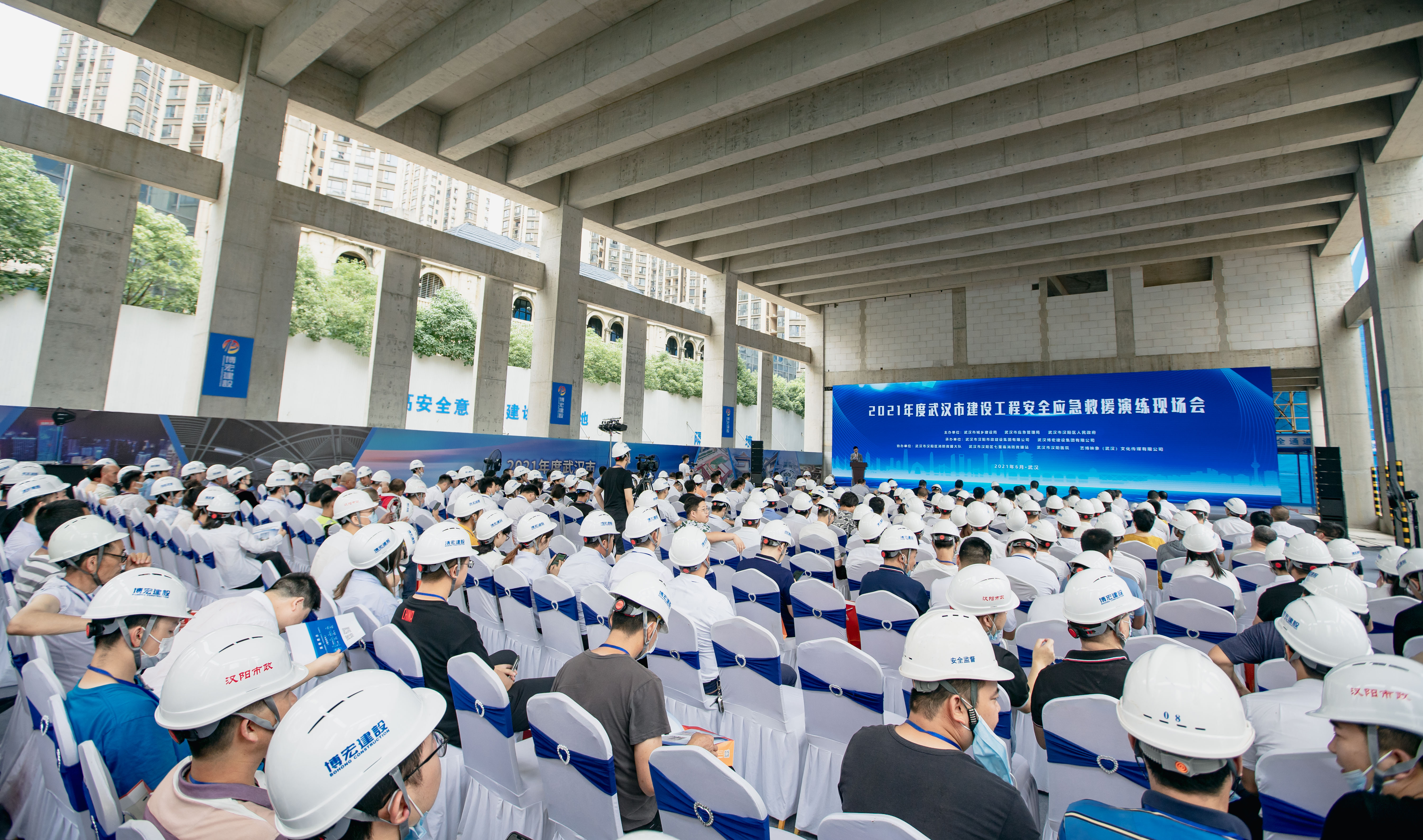 以全國第20個(gè)“安全生產(chǎn)月”為契機(jī),“2021年度武漢市建設(shè)工程安全應(yīng)急救援演練現(xiàn)場(chǎng)會(huì)”活動(dòng)在漢陽市政博宏公司漢陽市政建設(shè)大廈項(xiàng)目現(xiàn)場(chǎng)順利舉行。武漢市城鄉(xiāng)建設(shè)局副局長榮先國、武漢市應(yīng)急管理局副局長喻思源、武漢市漢陽區(qū)副區(qū)長蔡松、湖北省質(zhì)安總站副站長周偉、武漢市安全站站長楊劼、武漢建筑業(yè)協(xié)會(huì)秘書長李祥林、漢陽區(qū)建設(shè)局局長胡紅勝、漢陽區(qū)應(yīng)急管理局局長李漢光、各區(qū)建設(shè)局、相關(guān)建設(shè)單位及同行施工單位共計(jì)400余人參加本次活動(dòng)?;顒?dòng)由漢陽市政集團(tuán)公司、漢陽市政博宏公司共同承辦。