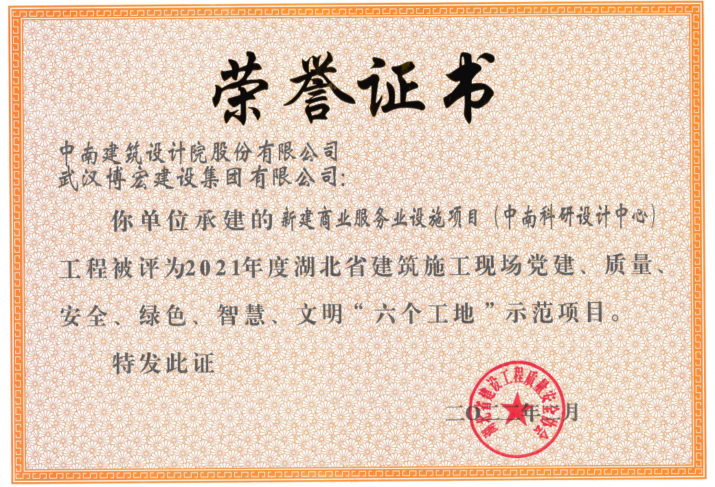 近日,2021年度湖北省建筑施工現(xiàn)場黨建、質(zhì)量、安全、綠色、智慧、文明“六個工地”評比結(jié)果正式公布,全省共計97項工程被評為示范項目,博宏建設(shè)新建商業(yè)服務(wù)業(yè)設(shè)施項目(中南科研設(shè)計中心)和博宏建設(shè)旗下合資公司湖北長投建筑工程有限公司承建的荊門龍山中央商務(wù)區(qū)7#地塊項目雙雙獲獎。