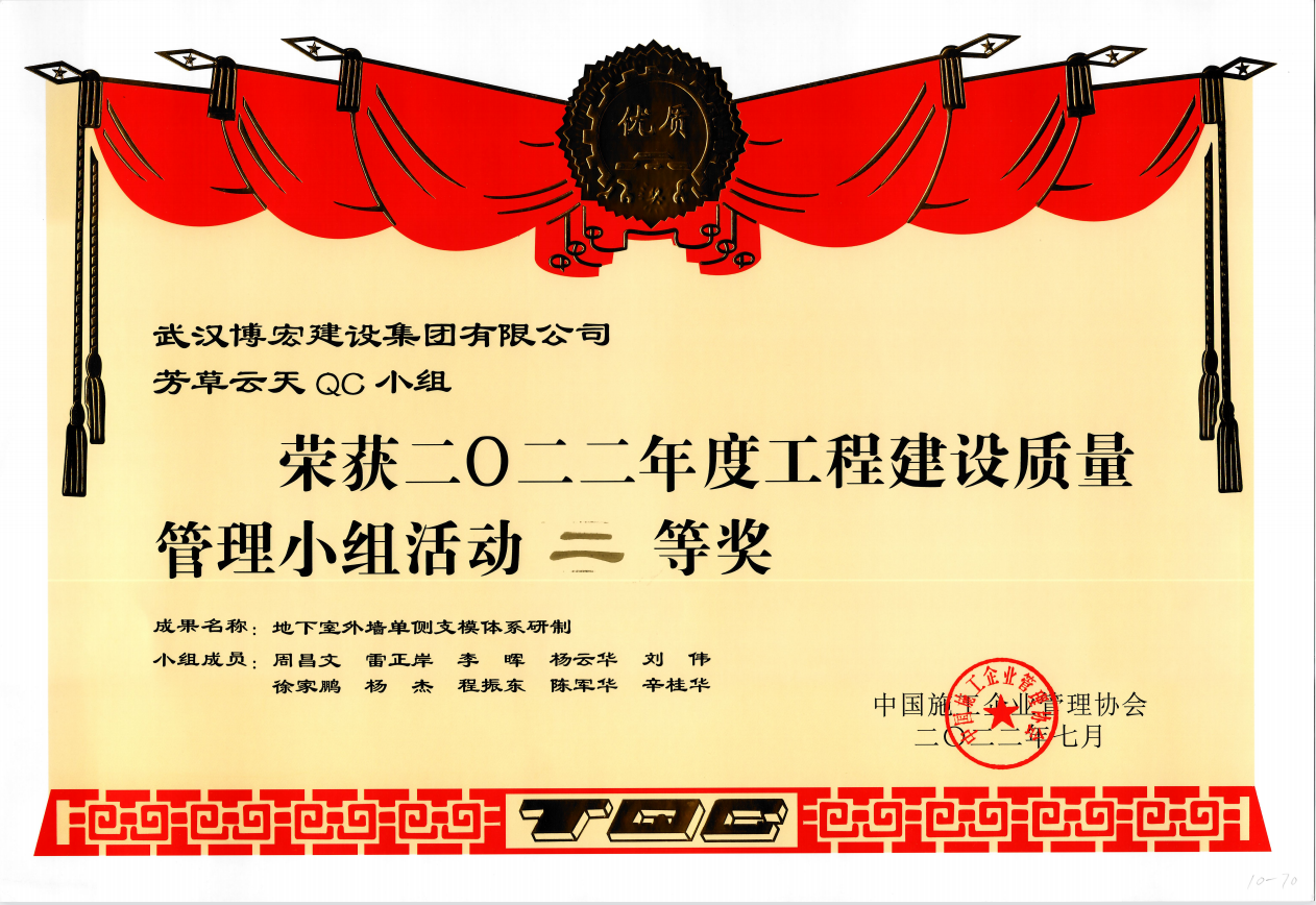 近年來,公司成立了多個(gè)QC小組,積極參與公司技術(shù)研發(fā)工作,以技術(shù)創(chuàng)新提升市場核心競爭力,努力打造新的增長極。目前,我司的QC小組課題始終堅(jiān)持問題導(dǎo)向原則,緊扣技術(shù)創(chuàng)新、施工生產(chǎn)、質(zhì)量管理等重點(diǎn)、難點(diǎn)問題,積極開展QC小組攻關(guān),并參與各級協(xié)會組織的QC競賽活動(dòng),獲得省I類成果9項(xiàng)、II類成果5項(xiàng)、III類成果4項(xiàng),其中1項(xiàng)成果榮獲武漢建筑業(yè)協(xié)會QC銀獎(jiǎng)。