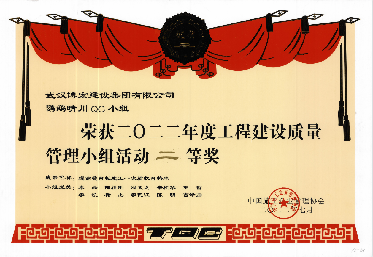近日,由中國施工企業(yè)管理協(xié)會主辦的“2022年工程建設(shè)質(zhì)量管理小組競賽活動(dòng)復(fù)賽和決賽”已圓滿結(jié)束,由我司報(bào)送的4項(xiàng)成果經(jīng)歷層層角逐,在全國1113個(gè)成果中脫穎而出。其中博宏先鋒QC小組的代表成果《提高金剛砂地坪一次驗(yàn)收合格率》榮獲一等獎(jiǎng)、芳草云天QC小組的代表成果《地下室外墻單側(cè)支模體系研制》與鸚鵡晴川QC小組的代表成果《提高疊合板施工一次驗(yàn)收合格率》榮獲二等獎(jiǎng)、博宏機(jī)電之星QC小組的代表成果《提高消防噴淋頭安裝定位準(zhǔn)確率》榮獲三等獎(jiǎng),博宏建設(shè)集團(tuán)QC成果再次取得重大突破!