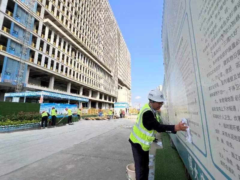 針對(duì)辦公區(qū),作業(yè)區(qū)和生活區(qū)施工環(huán)境的薄弱環(huán)節(jié),區(qū)建筑管理站工作人員與項(xiàng)目現(xiàn)場(chǎng)人員一起拿起掃帚、拖把、抹布等清潔工具,“擼起袖子”對(duì)綠化、圍擋、路面的環(huán)境衛(wèi)生情況進(jìn)行清潔整治,以查漏補(bǔ)缺的方式做好項(xiàng)目文明施工的細(xì)節(jié),不留一處死角,杜絕“臟、亂、差”現(xiàn)象,實(shí)打?qū)嵵?xiàng)目成為清潔工地。
